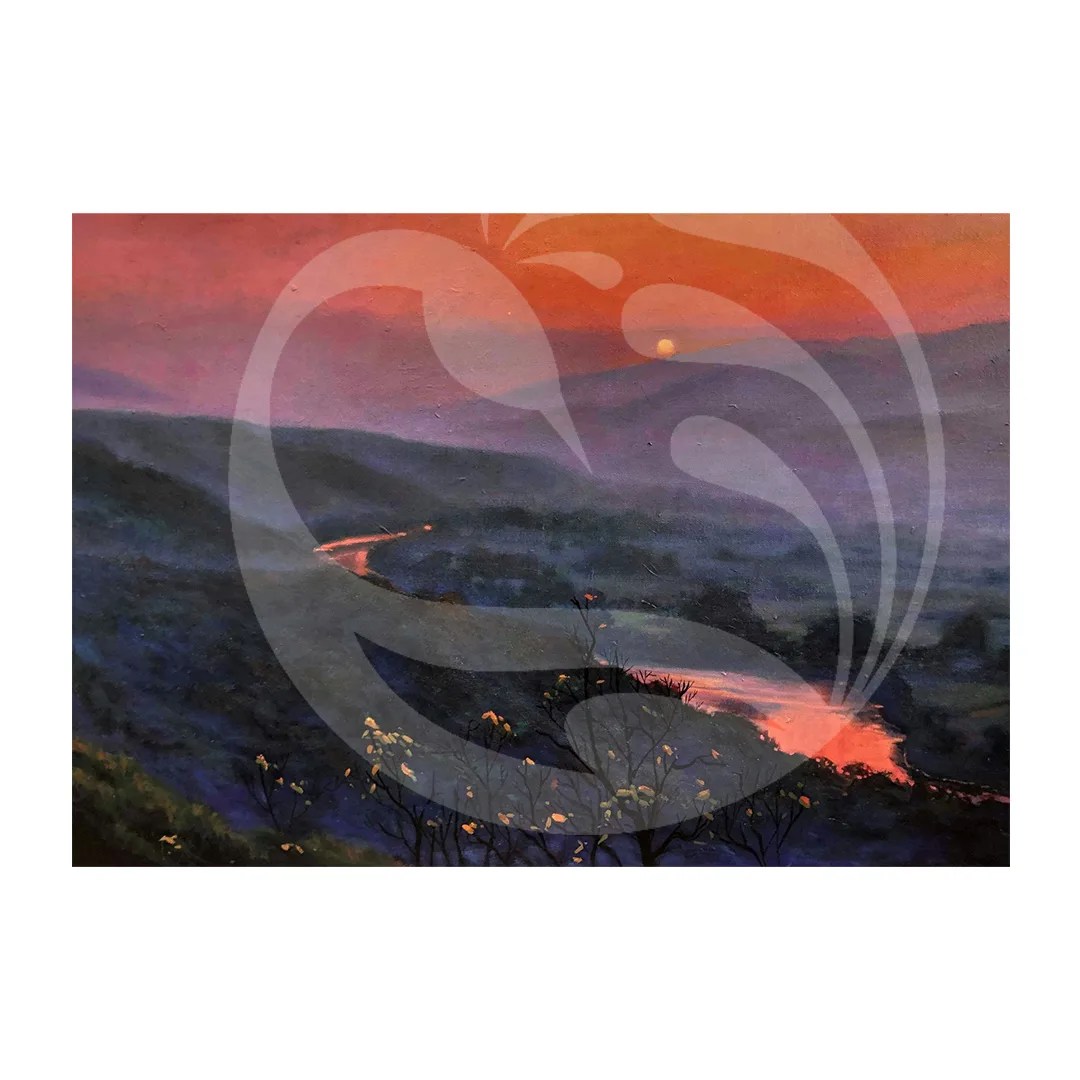 A tranquil sunset scene with rolling blue-purple hills, dark tree silhouettes, and an orange-lit river winding through.